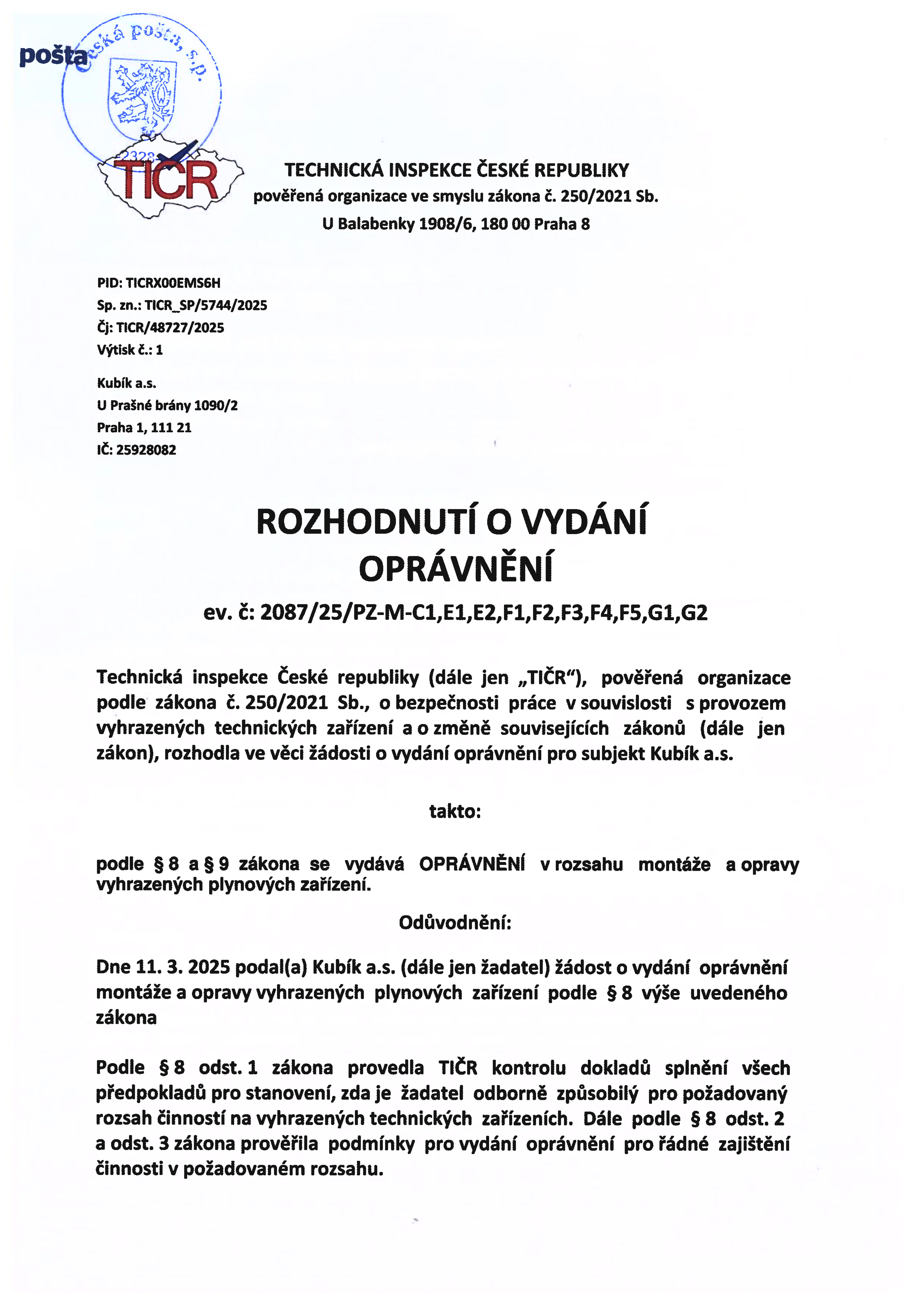 vydané Technickou inspekcí České republiky podle zákona č. 250/2021 Sb. o bezpečnosti práce v souvislosti s provozem vyhrazených technických zařízení podle §8 a §9 zákona se vydává OPRÁVNĚNÍ v rozsahu montáže a opravy vyhrazených plynových zařízení.